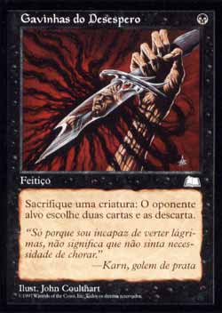 | Nome em Inglês: | Tendrils of Despair | | Nome em Português: | Gavinhas do Desespero | | Custo de Mana: |  | | Tipo: | Feitiço | | Texto: | Como um custo adicional para Conjurar Tendrils of Despair, sacrifique uma criatura. O oponente alvo descarta dois cards. | | Série: |  | | Raridade: | Comum | | Card: | 083 |