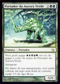 | Nome em Inglês: | Bringer of the Green Dawn | | Nome em Português: | Portador da Aurora Verde | | Custo de Mana: |    | | Tipo: | Criatura - Portador (1) | | Texto: | Você pode pagar     em vez de pagar o custo de mana de Bringer of the Green Dawn. Atropelar. No início de sua Etapa de Manutenção, coloque no Campo de Batalha uma ficha de criatura verde 3/3 do tipo Besta. | | P/T: | 5/5 | | Série: |  | | Raridade: | Raro | | Card: | 083 |