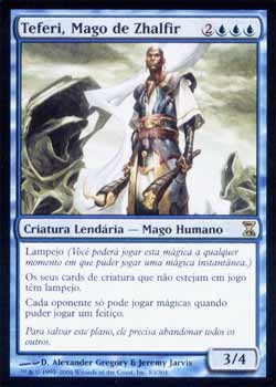 | Nome em Inglês: | Teferi, Mage of Zhalfir | | Nome em Português: | Teferi, Mago de Zhalfir | | Custo de Mana: |     | | Tipo: | Criatura Lendária - Humano Mago | | Texto: | Lampejo. Os cards de criatura que você possui e que não estejam no Campo de Batalha têm Lampejo. Cada oponente só pode Conjurar mágicas a qualquer momento em que aquele jogador pudesse Conjurar um feitiço. | | P/T: | 3/4 | | Série: |  | | Outras: | | | Raridade: | Raro | | Card: | 083 |