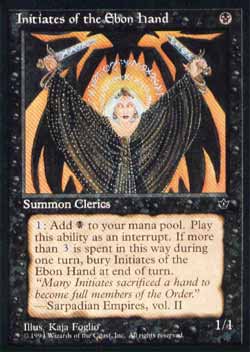 | Nome em Inglês: | Initiates of the Ebon Hand | | Nome em Português: | Sem nome em Português | | Custo de Mana: |  | | Tipo: | Criatura - Clérigo | | Texto: | : Adiciona a sua reserva de mana. Se esta habilidade tiver sido Ativada quatro ou mais vezes durante este turno, sacrifique Initiates of the Ebon Hand no início da próxima Etapa Final. | | P/T: | 1/1 | | Série: |  | | Outras: | | | Raridade: | Comum | | Card: | 084 |