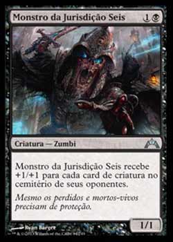 | Nome em Inglês: | Wight of Precinct Six | | Nome em Português: | Monstro da Jurisdição Seis | | Custo de Mana: |   | | Tipo: | Criatura - Zumbi | | Texto: | Wight of Precinct Six ganha +1/+1 para cada card de criatura nos cemitérios de seus oponentes. | | P/T: | 1/1 | | Série: |  | | Outras: | | | Raridade: | Incomum | | Card: | 084 |