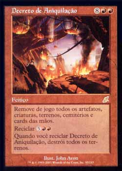 | Nome em Inglês: | Decree of Annihilation | | Nome em Português: | Decreto de Aniquilação | | Custo de Mana: |    | | Tipo: | Feitiço | | Texto: | Exile todos os artefatos, criaturas, terrenos, cemitérios, e cards nas mãos dos jogadores. Reciclar   . Quando você Reciclar Decree of Annihilation, destrói todos os terrenos. | | Série: |  | | Raridade: | Raro | | Card: | 085 |