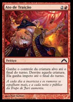 | Nome em Inglês: | Act of Treason | | Nome em Português: | Ato de Traição | | Custo de Mana: |   | | Tipo: | Feitiço | | Texto: | Ganhe o controle da criatura alvo até o final do turno. Desvire aquela criatura. Aquela criatura tem Ímpeto até o final do turno. | | Série: |  | | Outras: | | | Raridade: | Comum | | Card: | 085 |