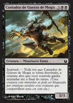 | Nome em Inglês: | Warchanter of Mogis | | Nome em Português: | Cantador de Guerra de Mogis | | Custo de Mana: |    | | Tipo: | Criatura - Minotauro Xamã | | Texto: | Inspirado - Toda vez que Warchanter of Mogis for desvirado, a criatura alvo que você controla tem Intimidar até o final do turno. | | P/T: | 3/3 | | Série: |  | | Raridade: | Comum | | Card: | 085 |