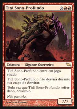 | Nome em Inglês: | Deep-Slumber Titan | | Nome em Português: | Titã Sono-Profundo | | Custo de Mana: |    | | Tipo: | Criatura - Gigante Guerreiro | | Texto: | Deep-Slumber Titan entra no Campo de Batalha virado. Deep-Slumber Titan não desvira durante sua Etapa de Desvirar. Toda vez que Deep-Slumber Titan sofrer dano, desvire-o. | | P/T: | 7/7 | | Série: |  | | Raridade: | Raro | | Card: | 089 |