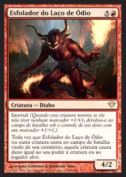 | Nome em Inglês: | Flayer of the Hatebound | | Nome em Português: | Esfolador do Laço de Ódio | | Custo de Mana: |   | | Tipo: | Criatura - Diabo | | Texto: | Imortal. Toda vez que Flayer of the Hatebound ou outra criatura entrar no Campo de Batalha vindo de seu cemitério, aquela criatura causa uma quantidade de pontos de dano igual ao seu poder à criatura ou ao jogador alvo. | | P/T: | 4/2 | | Série: |  | | Raridade: | Raro | | Card: | 089 |