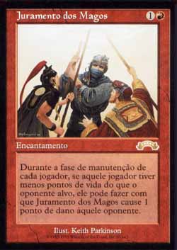 | Nome em Inglês: | Oath of Mages | | Nome em Português: | Juramento dos Magos | | Custo de Mana: |   | | Tipo: | Encantamento | | Texto: | No início da Etapa de Manutenção de cada jogador, aquele jogador pode fazer com que Oath of Mages cause 1 ponto de dano a um oponente alvo daquele jogador, à escolha daquele jogador, desde que aquele oponente tenha mais pontos de vida do que aquele jogador. | | Série: |  | | Raridade: | Raro | | Card: | 090 |