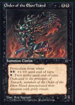 | Nome em Inglês: | Order of the Ebon Hand | | Nome em Português: | Sem nome em Português | | Custo de Mana: |   | | Tipo: | Criatura - Clérigo Cavaleiro | | Texto: | Proteção contra o branco.