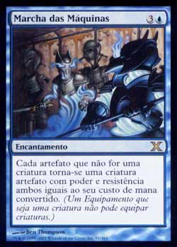 | Nome em Inglês: | March of the Machines | | Nome em Português: | Marcha das Máquinas | | Custo de Mana: |   | | Tipo: | Encantamento | | Texto: | Cada artefato que não seja uma criatura é uma criatura artefato com poder e resistência ambos iguais ao seu Custo de Mana Convertido (um Equipamento que seja uma criatura não pode Equipar uma criatura.) | | Série: |  | | Outras: | | | Raridade: | Raro | | Card: | 091 |