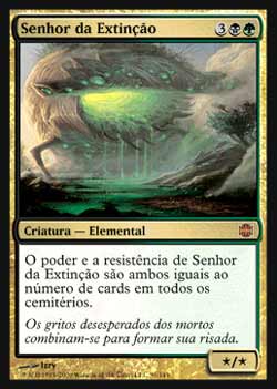 | Nome em Inglês: | Lord of Extinction | | Nome em Português: | Senhor da Extinção | | Custo de Mana: |    | | Tipo: | Criatura - Elemental | | Texto: | O poder e a resistência de Lord of Extinction são ambos iguais ao número de cards em todos os cemitérios. | | P/T: | */* | | Série: |  | | Raridade: | Mítico Raro | | Card: | 091 |