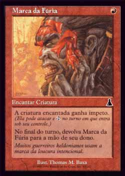 | Nome em Inglês: | Mark of Fury | | Nome em Português: | Marca da Fúria | | Custo de Mana: |  | | Tipo: | Encantamento - Aura | | Texto: | Encantar criatura. A criatura encantada tem Ímpeto. No início da próxima Etapa Final, devolva Mark of Fury para a mão de seu dono. | | Série: |  | | Raridade: | Comum | | Card: | 093 |