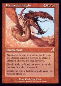 | Nome em Inglês: | Form of the Dragon | | Nome em Português: | Forma do Dragão | | Custo de Mana: |     | | Tipo: | Encantamento | | Texto: | No início de sua Etapa de Manutenção, Form of the Dragon causa 5 pontos de dano à criatura ou ao jogador alvo. No final de cada turno, seu total de pontos de vida torna-se 5. Criaturas sem Voar não podem atacar você. | | Série: |  | | Outras: | | | Raridade: | Raro | | Card: | 093 |