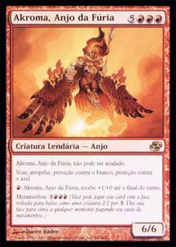 | Nome em Inglês: | Akroma, Angel of Fury | | Nome em Português: | Akroma, Anjo da Fúria | | Custo de Mana: |     | | Tipo: | Criatura Lendária - Anjo | | Texto: | Akroma, Angel of Fury não pode ser anulado. Voar, Atropelar, Proteção contra o branco, Proteção contra o azul.