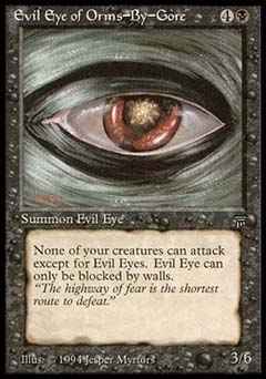| Nome em Inglês: | Evil Eye of Orms-By-Gore | | Nome em Português: | Sem nome em Português | | Custo de Mana: |   | | Tipo: | Criatura - Olho | | Texto: | Evil Eye of Orms-by-Gore não pode ser bloqueado exceto por Barreiras. Criaturas que você controla que não sejam Olhos não podem atacar. | | P/T: | 3/6 | | Série: |  | | Outras: | | | Raridade: | Incomum | | Card: | 096 |