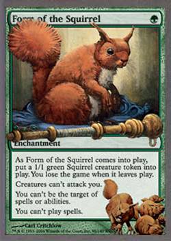 | Nome em Inglês: | Form of the Squirrel | | Nome em Português: | Sem nome em Português | | Custo de Mana: |  | | Tipo: | Encantamento | | Texto: | Conforme Form of the Squirrel entra no Campo de Batalha, coloque no Campo de Batalha uma ficha de criatura verde 1/1 do tipo Esquilo. Você perde o jogo quando aquela ficha deixar o Campo de Batalha. As criaturas não podem atacar você. Você tem Manto. Você não pode Conjurar mágicas. | | Série: |  | | Raridade: | Raro | | Card: | 096 |
