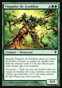 | Nome em Inglês: | Avenger of Zendikar | | Nome em Português: | Vingador de Zendikar | | Custo de Mana: |    | | Tipo: | Criatura - Elemental | | Texto: | Quando Avenger of Zendikar entrar no Campo de Batalha, coloque no Campo de Batalha uma ficha de criatura verde 0/1 do tipo Planta para cada terreno que você controla. Aterragem - Toda vez que um terreno entrar no Campo de Batalha sob seu controle, você pode colocar um marcador +1/+1 em cada criatura do tipo Planta que você controla. | | P/T: | 5/5 | | Série: |  | | Outras: | | | Raridade: | Mítico Raro | | Card: | 096 |