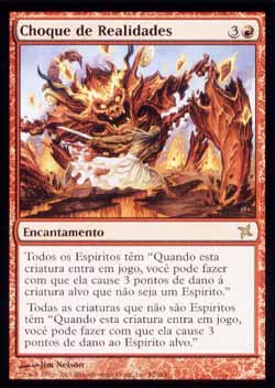 | Nome em Inglês: | Clash of Realities | | Nome em Português: | Choque de Realidades | | Custo de Mana: |   | | Tipo: | Encantamento | | Texto: | Todos os Espíritos têm 'Quando esta criatura entrar no Campo de Batalha, você pode fazer com que ela cause 3 pontos de dano à criatura alvo que não seja um Espírito.' Todas as criaturas que não sejam Espíritos têm 'Quando esta criatura entrar no Campo de Batalha, você pode fazer com que ela cause 3 pontos de dano ao Espírito alvo.' | | Série: |  | | Raridade: | Raro | | Card: | 097 |