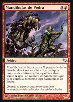 | Nome em Inglês: | Jaws of Stone | | Nome em Português: | Mandíbulas de Pedra | | Custo de Mana: |   | | Tipo: | Feitiço | | Texto: | Jaws of Stone causa X pontos de dano divididos da forma como você escolher entre qualquer número de criaturas e/ou jogadores alvo, onde X é o número de Montanhas que você controla conforme você Conjurar Jaws of Stone. | | Série: |  | | Outras: | | | Raridade: | Incomum | | Card: | 097 |