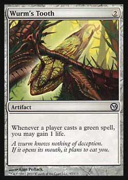 | Nome em Inglês: | Wurm's Tooth | | Nome em Português: | Sem nome em Português | | Custo de Mana: |  | | Tipo: | Artefato | | Texto: | Toda vez que um jogador Conjurar uma mágica verde, você pode ganhar 1 ponto de vida. | | Série: |  | | Outras: | | | Raridade: | Raro | | Card: | 097 |
