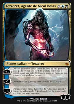 | Nome em Inglês: | Tezzeret, Agent of Bolas | | Nome em Português: | Tezzeret, Agente de Nicol Bolas | | Custo de Mana: |    | | Tipo: | Planeswalker - Tezzeret | | Texto: | +1: Olhe os cinco cards do topo de seu grimório. Você pode revelar um card de artefato dentre eles e colocá-lo em sua mão. Coloque o restante no fundo de seu grimório em qualquer ordem. -1: O artefato alvo torna-se uma criatura artefato 5/5. -4: O jogador alvo perde X pontos de vida e você ganha X pontos de vida, onde X é duas vezes o número de artefatos que você controla. | | P/T: | 3 | | Série: |  | | Raridade: | Mítico Raro | | Card: | 097 |