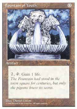 | Nome em Inglês: | Fountain of Youth | | Nome em Português: | Sem nome em Português | | Custo de Mana: |  | | Tipo: | Artefato | | Texto: | , : você ganha 1 ponto de vida. | | Série: |  | | Outras: | | | Raridade: | Comum | | Card: | 098 |
