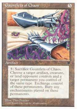 | Nome em Inglês: | Gauntlets of Chaos | | Nome em Português: | Sem nome em Português | | Custo de Mana: |  | | Tipo: | Artefato | | Texto: | , sacrifique Gauntlets of Chaos: Permute o controle de um artefato alvo, criatura alvo, ou terreno alvo controlado por um oponente por uma Permanente que você controla desde que as Permanentes sejam do mesmo tipo. Se estas Permanentes forem permutadas desta forma, destrói todas as Auras anexadas àquelas Permanentes. | | Série: |  | | Outras: | | | Raridade: | Raro | | Card: | 099 |