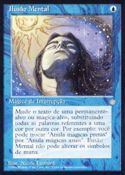 | Nome em Inglês: | Sleight of Mind | | Nome em Português: | Ilusão Mental | | Custo de Mana: |  | | Tipo: | Mágica Instantânea | | Texto: | Mude o texto da mágica alvo ou Permanente alvo substituindo todas as instâncias de um nome de uma cor por outro. | | Série: |  | | Outras: | | | Raridade: | Incomum | | Card: | 099 |