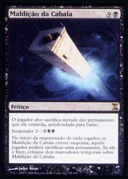 | Nome em Inglês: | Curse of the Cabal | | Nome em Português: | Maldição da Cabala | | Custo de Mana: |   | | Tipo: | Feitiço | | Texto: | O jogador alvo sacrifica metade das Permanentes que ele controla, arredondado para baixo. Suspender 2 -   . No início da Etapa de Manutenção de cada jogador, se Curse of the Cabal estiver Suspenso, aquele jogador sacrifica uma Permanente. Se ele não puder fazê-lo, coloque dois marcadores de tempo em Curse of the Cabal. | | Série: |  | | Raridade: | Raro | | Card: | 099 |