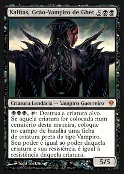 | Nome em Inglês: | Kalitas, Bloodchief of Ghet | | Nome em Português: | Kalitas, Grão-Vampiro de Ghet | | Custo de Mana: |    | | Tipo: | Criatura Lendária - Vampiro Guerreiro | | Texto: |   , : Destrói a criatura alvo. Se aquela criatura Morrer desta forma, coloque no Campo de Batalha uma ficha de criatura preta do tipo Vampiro, com poder igual ao poder daquela criatura e resistência igual à resistência daquela criatura. | | P/T: | 5/5 | | Série: |  | | Raridade: | Mítico Raro | | Card: | 099 |
