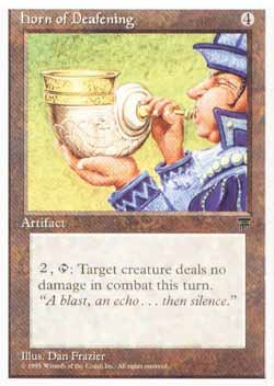 | Nome em Inglês: | Horn of Deafening | | Nome em Português: | Sem nome em Português | | Custo de Mana: |  | | Tipo: | Artefato | | Texto: | , : Previne todo o dano de combate que seria causado por uma criatura alvo durante este turno. | | Série: |  | | Outras: | | | Raridade: | Raro | | Card: | 100 |