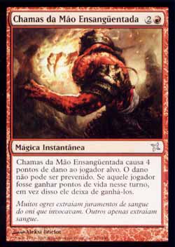 | Nome em Inglês: | Flames of the Blood Hand | | Nome em Português: | Chamas da Mão Ensangüentada | | Custo de Mana: |   | | Tipo: | Mágica Instantânea | | Texto: | Flames of the Blood Hand causa 4 pontos de dano ao jogador alvo. Aquele dano não pode ser prevenido. Se aquele jogador fosse ganhar vida durante este turno, aquele jogador não ganha vida ao invés. | | Série: |  | | Outras: | | | Raridade: | Incomum | | Card: | 101 |