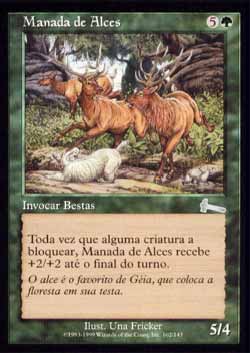 | Nome em Inglês: | Gang of Elk | | Nome em Português: | Manada de Alces | | Custo de Mana: |   | | Tipo: | Criatura - Alce Besta | | Texto: | Toda vez que Gang of Elk for bloqueado, ele ganha +2/+2 até o final do turno para cada criatura que o estiver bloqueando. | | P/T: | 5/4 | | Série: |  | | Outras: | | | Raridade: | Incomum | | Card: | 102 |