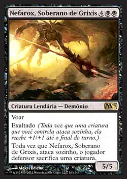 | Nome em Inglês: | Nefarox, Overlord of Grixis | | Nome em Português: | Nefarox, Soberano de Grixis | | Custo de Mana: |    | | Tipo: | Criatura Lendária - Demônio | | Texto: | Voar. Exaltado. Toda vez que Nefarox, Overlord of Grixis atacar sozinho, o jogador defensor sacrifica uma criatura. | | P/T: | 5/5 | | Série: |  | | Raridade: | Raro | | Card: | 103 |