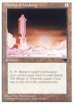 | Nome em Inglês: | Obelisk of Undoing | | Nome em Português: | Sem nome em Português | | Custo de Mana: |  | | Tipo: | Artefato | | Texto: | , : Devolva a Permanente alvo que você possui e controla para sua mão. | | Série: |  | | Outras: | | | Raridade: | Raro | | Card: | 104 |