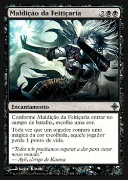 | Nome em Inglês: | Curse of Wizardry | | Nome em Português: | Maldição da Feitiçaria | | Custo de Mana: |    | | Tipo: | Encantamento | | Texto: | Conforme Curse of Wizardry entra no Campo de Batalha, escolha uma cor. Toda vez que um jogador Conjurar uma mágica da cor escolhida, aquele jogador perde 1 ponto de vida. | | Série: |  | | Raridade: | Incomum | | Card: | 104 |