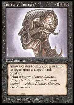 | Nome em Inglês: | Horror of Horrors | | Nome em Português: | Sem nome em Português | | Custo de Mana: |    | | Tipo: | Encantamento | | Texto: | Sacrifique um Pântano: Regenera a criatura alvo preta. | | Série: |  | | Outras: | | | Raridade: | Incomum | | Card: | 106 |