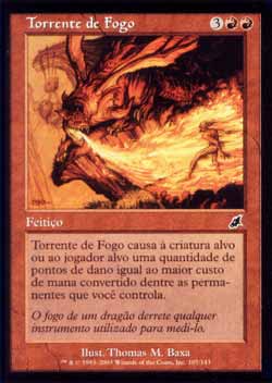 | Nome em Inglês: | Torrent of Fire | | Nome em Português: | Torrente de Fogo | | Custo de Mana: |    | | Tipo: | Feitiço | | Texto: | Torrent of Fire causa uma quantidade de pontos de dano igual ao maior Custo de Mana Convertido entre as Permanentes que você controla à criatura ou ao jogador alvo. | | Série: |  | | Raridade: | Comum | | Card: | 107 |
