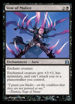 | Nome em Inglês: | Vow of Malice | | Nome em Português: | Sem nome em Português | | Custo de Mana: |   | | Tipo: | Encantamento - Aura | | Texto: | Encantar criatura. A criatura encantada ganha +2/+2, tem Intimidar, e não pode atacar você ou um Planeswalker que você controla. | | Série: |  | | Raridade: | Incomum | | Card: | 107 |