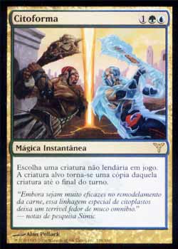| Nome em Inglês: | Cytoshape | | Nome em Português: | Citoforma | | Custo de Mana: |    | | Tipo: | Mágica Instantânea | | Texto: | Escolha uma criatura não Lendária no Campo de Batalha. A criatura alvo se torna uma cópia da criatura escolhida até o final do turno. | | Série: |  | | Raridade: | Raro | | Card: | 108 |