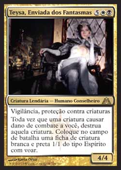 | Nome em Inglês: | Teysa, Envoy of Ghosts | | Nome em Português: | Teysa, Enviada dos Fantasmas | | Custo de Mana: |    | | Tipo: | Criatura Lendária - Humano Conselheiro | | Texto: | Vigilância, Proteção contra Criaturas. Toda vez que uma criatura causar dano de combate a você, destrói aquela criatura. Coloque no Campo de Batalha uma ficha de criatura branca e preta 1/1 do tipo Espírito com Voar. | | P/T: | 4/4 | | Série: |  | | Raridade: | Raro | | Card: | 108 |
