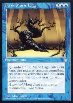 | Nome em Inglês: | Wrath of Marit Lage | | Nome em Português: | Ira de Marit Lage | | Custo de Mana: |    | | Tipo: | Encantamento | | Texto: | As criaturas vermelhas não desviram durante as Etapas de Desvirar de seus controladores. Quando Wrath of Marit Lage entrar no Campo de Batalha, vire todas as criaturas vermelhas. | | Série: |  | | Outras: | | | Raridade: | Raro | | Card: | 109 |