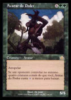 | Nome em Inglês: | Avatar of Might | | Nome em Português: | Avatar do Poder | | Custo de Mana: |    | | Tipo: | Criatura - Avatar | | Texto: | Atropelar. Se um oponente controlar ao menos quatro criaturas a mais que você, Avatar of Might custa a menos para ser Conjurado. | | P/T: | 8/8 | | Série: |  | | Outras: | | | Raridade: | Raro | | Card: | 109 |