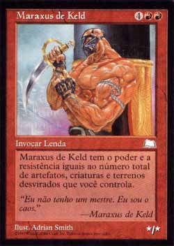 | Nome em Inglês: | Maraxus of Keld | | Nome em Português: | Maraxus de Keld | | Custo de Mana: |    | | Tipo: | Criatura Lendária - Humano Guerreiro | | Texto: | O poder e a resistência de Maraxus of Keld são ambos iguais ao número de artefatos, criaturas e terrenos desvirados que você controla. | | P/T: | */* | | Série: |  | | Raridade: | Raro | | Card: | 111 |