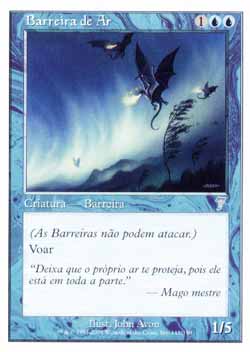 | Nome em Inglês: | Wall of Air | | Nome em Português: | Barreira de Ar | | Custo de Mana: |    | | Tipo: | Criatura - Barreira | | Texto: | Defensor, Voar. | | P/T: | 1/5 | | Série: |  | | Outras: | | | Raridade: | Incomum | | Card: | 111 |