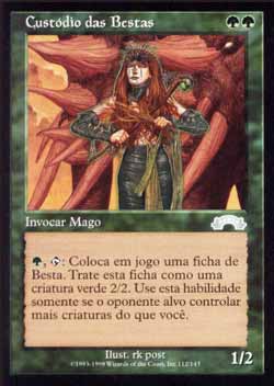 | Nome em Inglês: | Keeper of the Beasts | | Nome em Português: | Custódio das Bestas | | Custo de Mana: |   | | Tipo: | Criatura - Humano Mago | | Texto: | , : Coloque no Campo de Batalha uma ficha de criatura verde 2/2 do tipo Besta. Ative esta habilidade apenas se um oponente controlar mais criaturas do que você. | | P/T: | 1/2 | | Série: |  | | Raridade: | Incomum | | Card: | 112 |