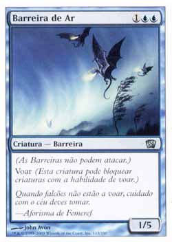 | Nome em Inglês: | Wall of Air | | Nome em Português: | Barreira de Ar | | Custo de Mana: |    | | Tipo: | Criatura - Barreira | | Texto: | Defensor, Voar. | | P/T: | 1/5 | | Série: |  | | Outras: | | | Raridade: | Incomum | | Card: | 113 |