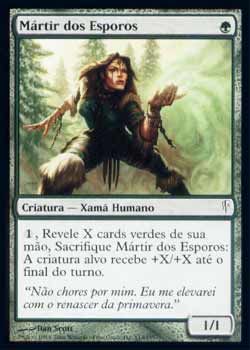 | Nome em Inglês: | Martyr of Spores | | Nome em Português: | Mártir dos Esporos | | Custo de Mana: |  | | Tipo: | Criatura - Humano Xamã | | Texto: | , revele X cards verdes de sua mão, sacrifique Martyr of Spores: A criatura alvo ganha +X/+X até o final do turno. | | P/T: | 1/1 | | Série: |  | | Raridade: | Comum | | Card: | 113 |