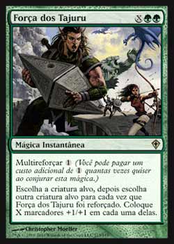 | Nome em Inglês: | Strength of the Tajuru | | Nome em Português: | Força dos Tajuru | | Custo de Mana: |    | | Tipo: | Mágica Instantânea | | Texto: | Multireforçar . Escolha uma criatura alvo, então escolha outra criatura alvo para cada vez que Strength of the Tajuru foi Reforçado. Coloque X marcadores +1/+1 em cada uma daquelas criaturas. | | Série: |  | | Raridade: | Raro | | Card: | 113 |