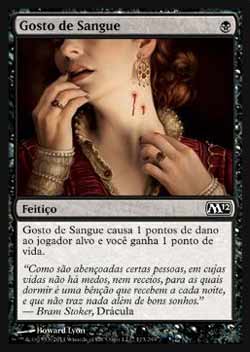 | Nome em Inglês: | Taste of Blood | | Nome em Português: | Gosto de Sangue | | Custo de Mana: |  | | Tipo: | Feitiço | | Texto: | Taste of Blood causa 1 ponto de dano ao jogador alvo e você ganha 1 ponto de vida. | | Série: |  | | Raridade: | Comum | | Card: | 113 |