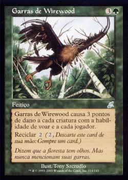 | Nome em Inglês: | Claws of Wirewood | | Nome em Português: | Garras de Wirewood | | Custo de Mana: |   | | Tipo: | Feitiço | | Texto: | Claws of Wirewood causa 3 pontos de dano a cada criatura com Voar e a cada jogador. Reciclar . | | Série: |  | | Raridade: | Incomum | | Card: | 114 |